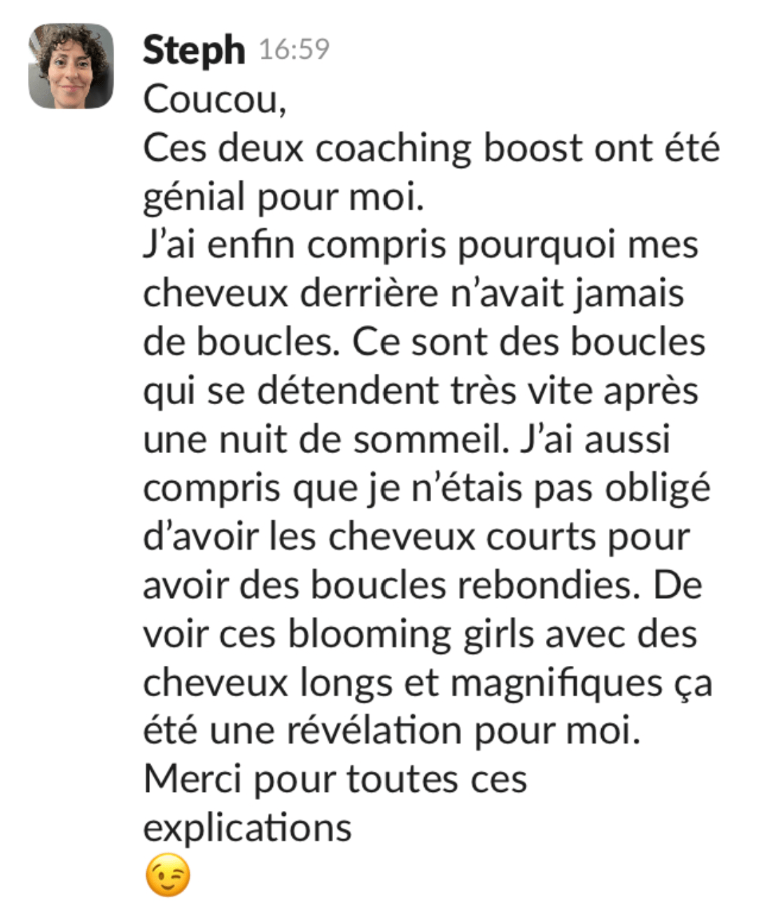 👉 Le coaching capillaire Blooming Girls (4 mois) est un accompagnement approfondi et individualisé, destiné aux femmes qui veulent aller plus loin et travailler sur la tenue de leurs boucles entre les shampoings, avec un suivi personnalisé pour devenir autonomes et être sereines au quotidien.