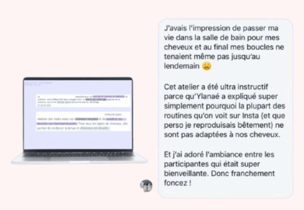 Le Bootcamp est conçu pour t’aider à comprendre tes cheveux et observer des améliorations lorsque tu mets en pratique les ajustements proposés. Tu n’es pas seule : l’accompagnement et les échanges sont là pour t’aider à clarifer et ajuster quand quelque chose bloque.