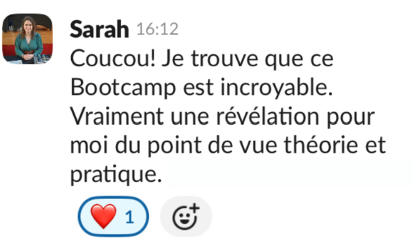Oui. Le Bootcamp Objectif J+7 se distingue par son accompagnement sur plusieurs jours, la présence de coachs sur Slack pour t’apporter des réponses personnalisées, et les fiches synthèses après chaque atelier, pour faciliter la compréhension et la mise en pratique.