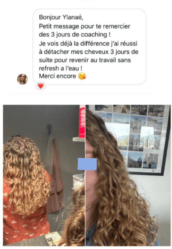 6 ans plus tard, j’ai accompagné avec mon coaching capillaire Blooming Girls 750+ femmes pour les aider à se libérer de la charge mentale de leurs cheveux et garder des boucles jusqu’à leur prochain shampoing grâce à une approche 100% scientifique, sans achat nouveaux produits capillaires.