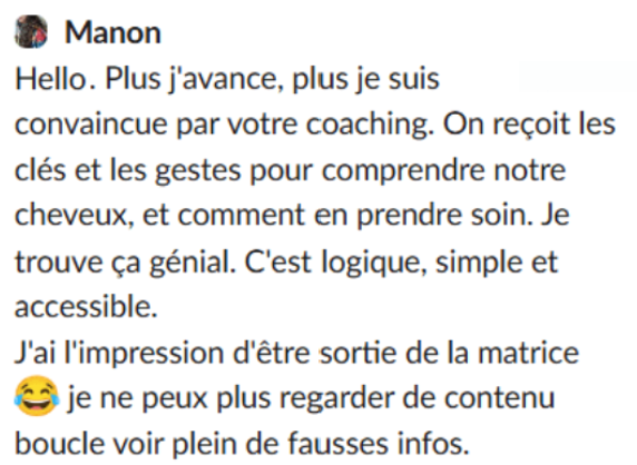 Le Bootcamp est conçu pour t’aider à comprendre tes cheveux et observer des améliorations lorsque tu mets en pratique les ajustements proposés. Tu n’es pas seule : l’accompagnement et les échanges sont là pour t’aider à clarifer et ajuster quand quelque chose bloque.