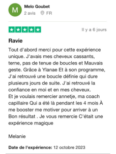 Cet accompagnement, c’est une combinaison parfaite entre des conseils capillaires et du coaching en développement personnel, pour te poser les bonnes questions, pour t’amener vers tes propres déclics.